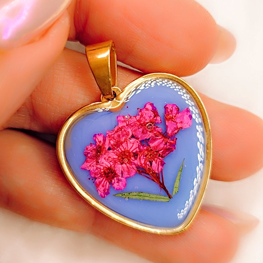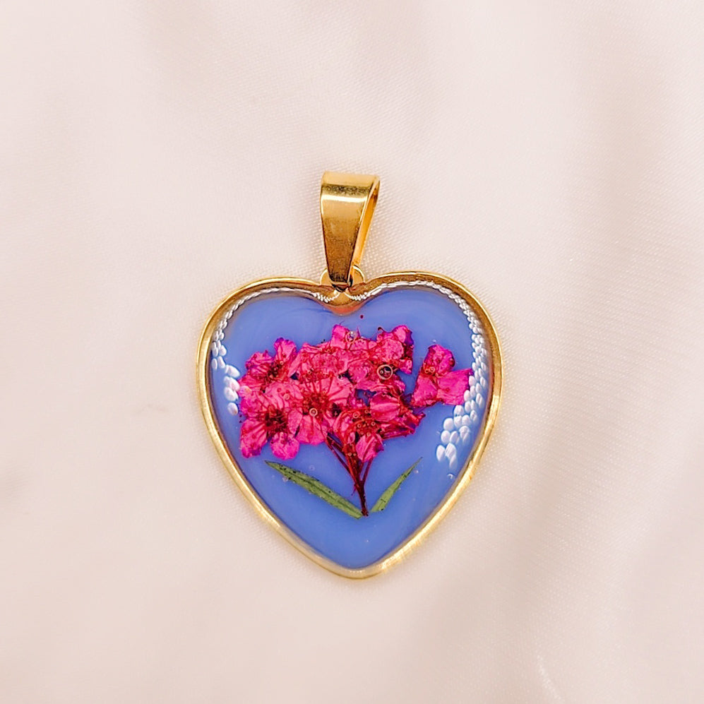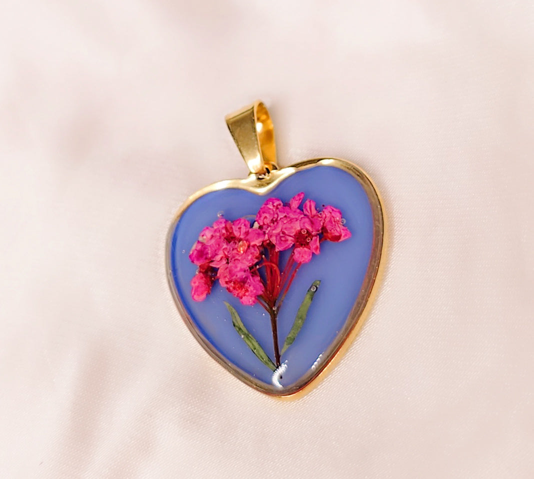 Bellissimo ciondolo in resina realizzato a mano. Ogni pezzo è unico, in edizione limitata, con delicati petali e foglie naturali che si intrecciano all'interno della resina, creando un effetto raffinato e sofisticato. La montatura in acciaio placcato oro aggiunge luminosità e resistenza, esaltando la bellezza dei dettagli. Un pezzo esclusivo che racconta la bellezza della natura in un design senza tempo.