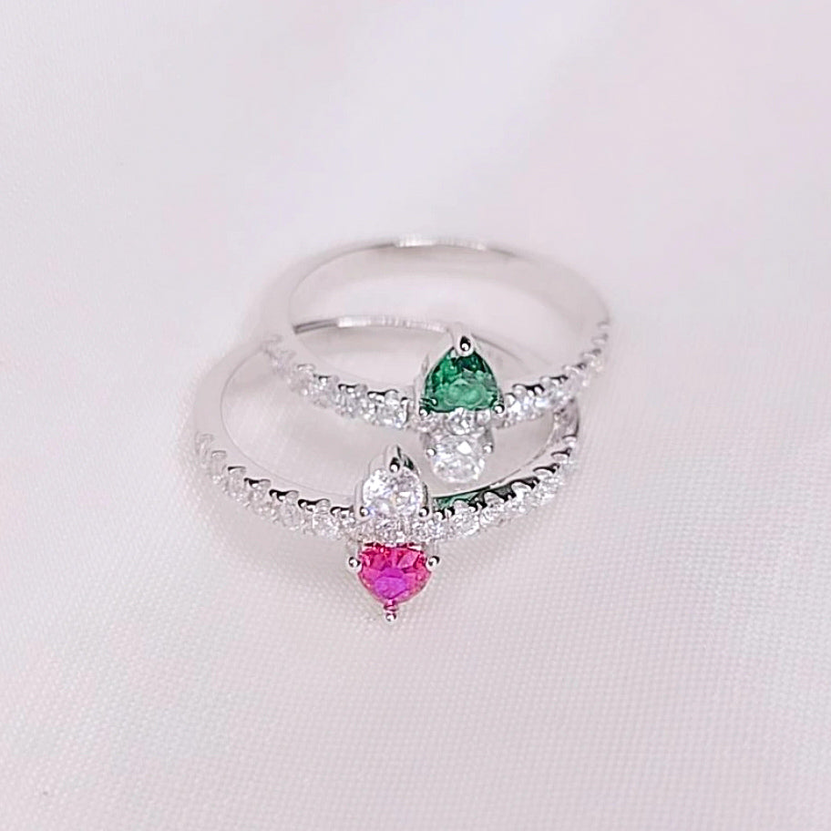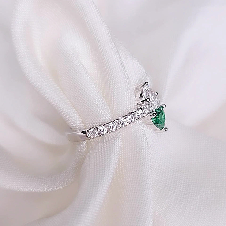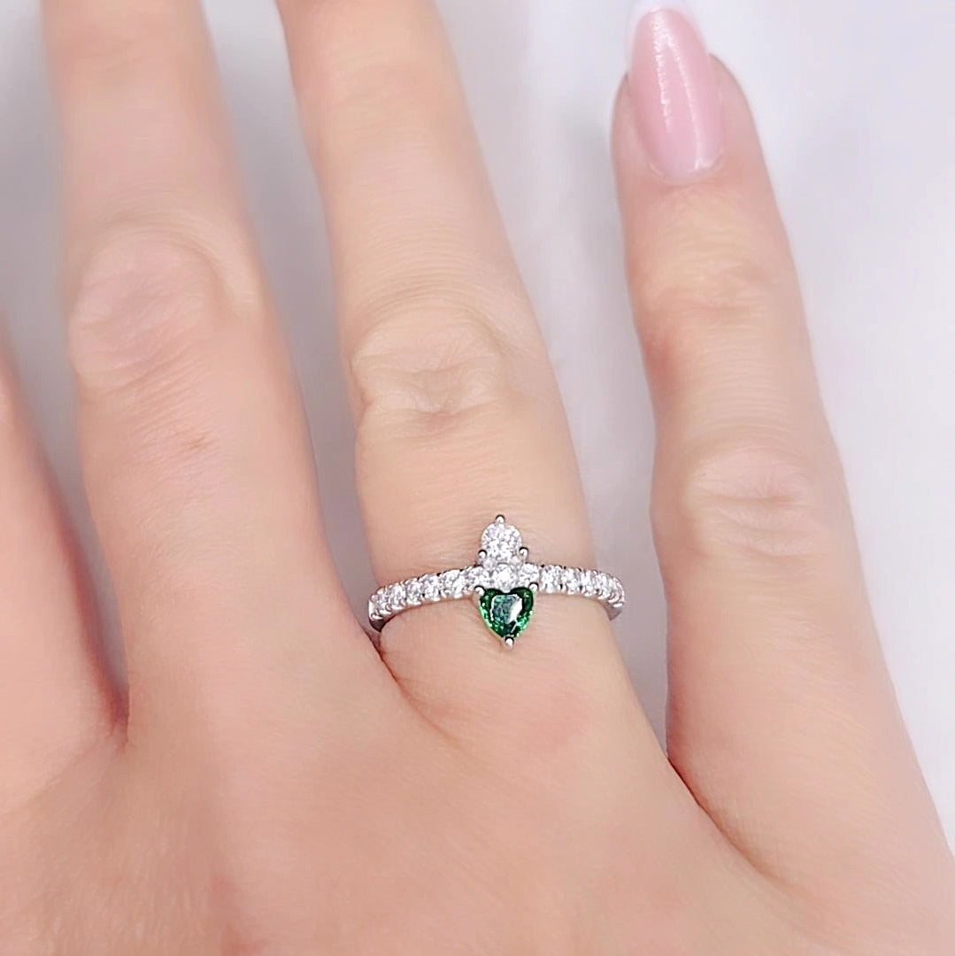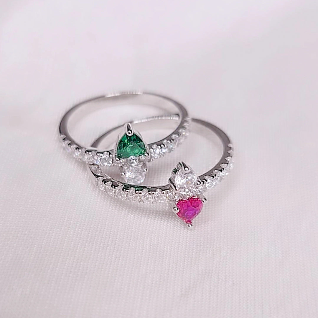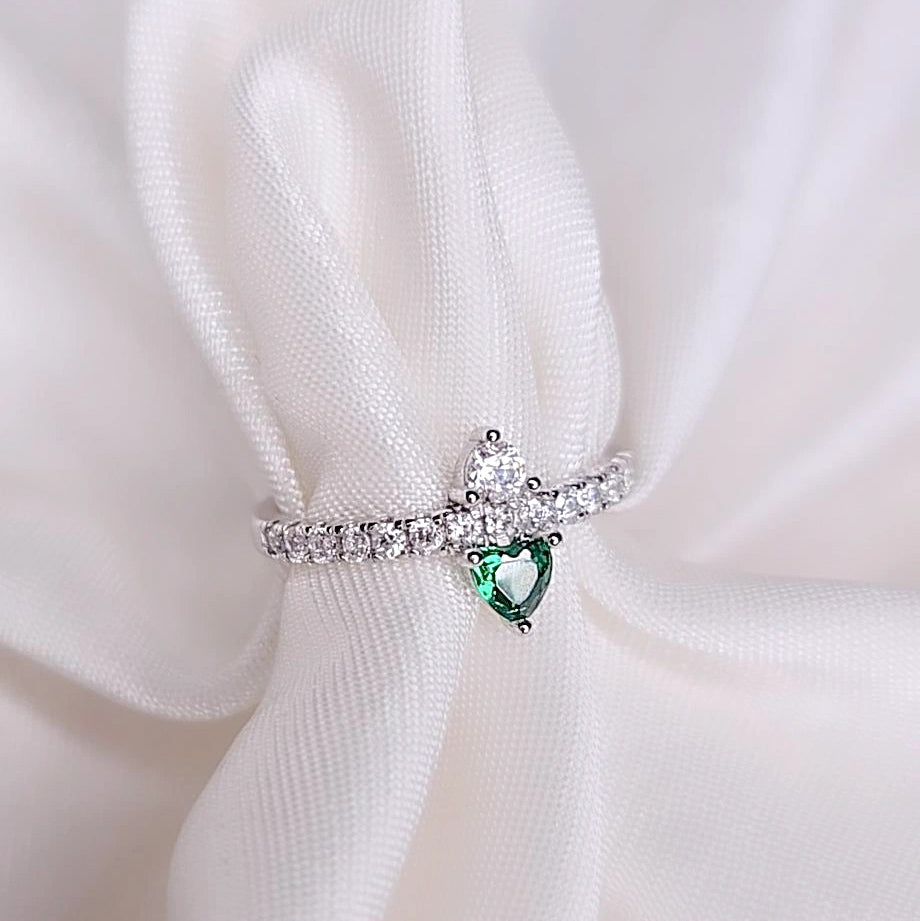 L’anello è impreziosito da una fila di zirconi bianchi incastonati lungo tutta la fascia, mentre al centro brillano due cuori rovesciati, uno con zircone bianco e l’altro con zircone verde intenso, simbolo di speranza, equilibrio e rinascita.