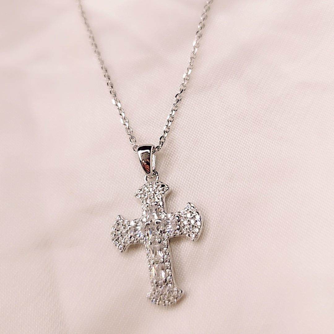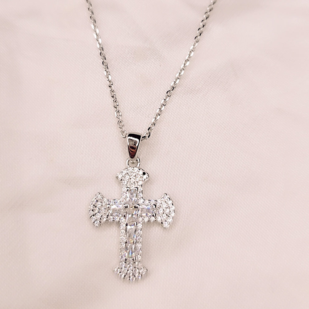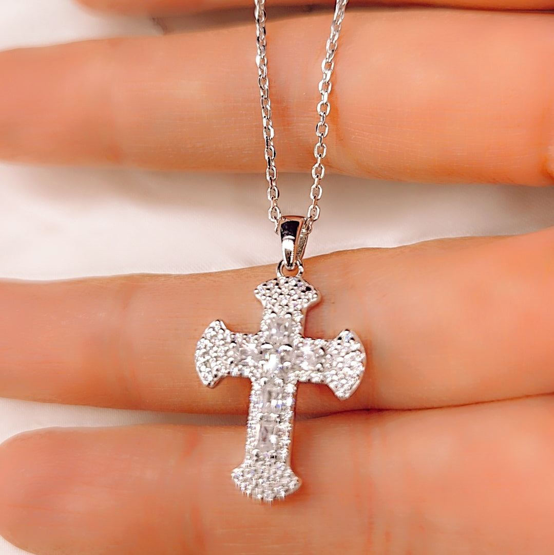 Il ciondolo a Croce presenta un design ricercato: il corpo centrale è impreziosito da un binario di zirconi taglio baguette, mentre le estremità sono contornate da micro-zirconi incastonati che massimizzano la luminosità, creando un effetto "pavé" scintillante. La sua forma sagomata e bombata aggiunge profondità e unicità al gioiello.