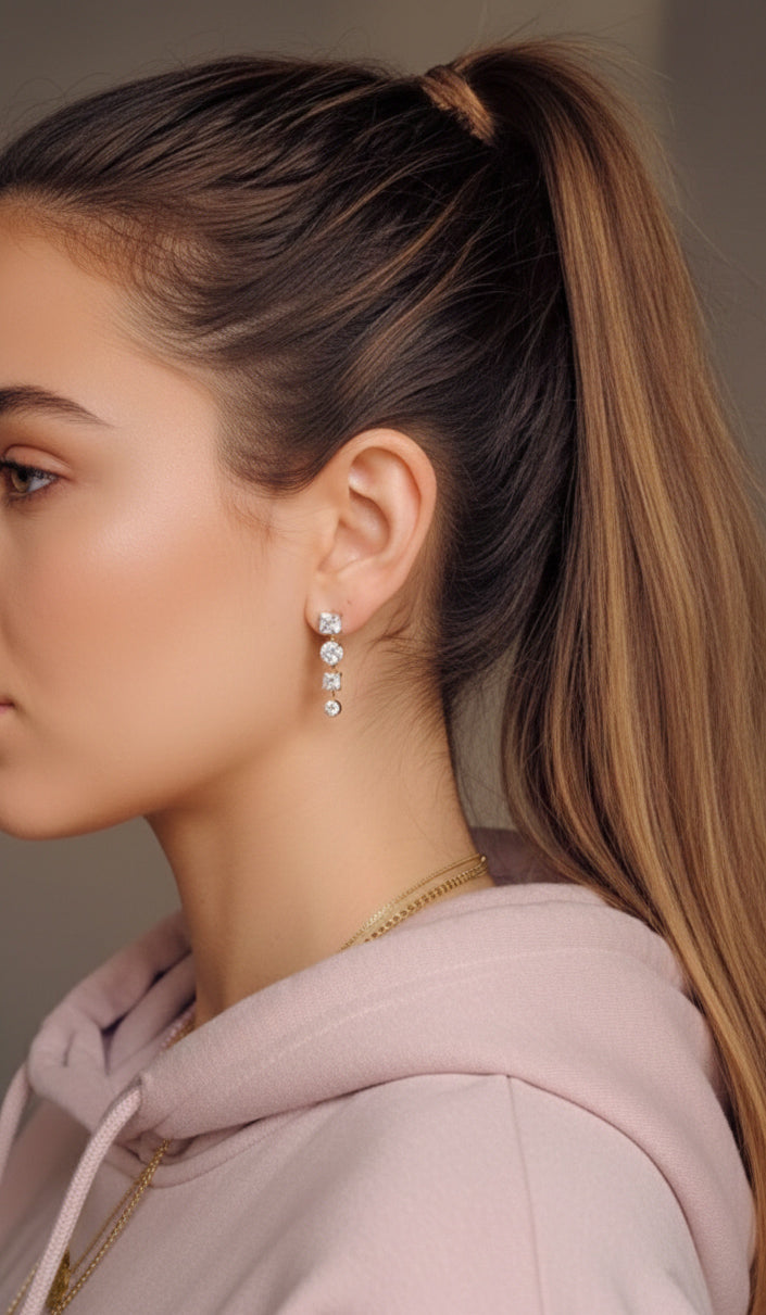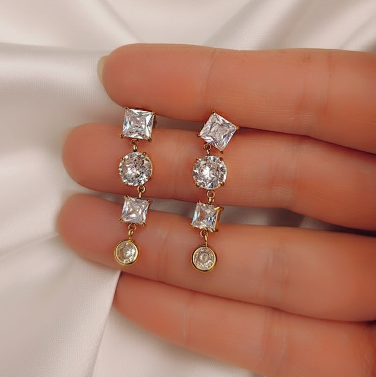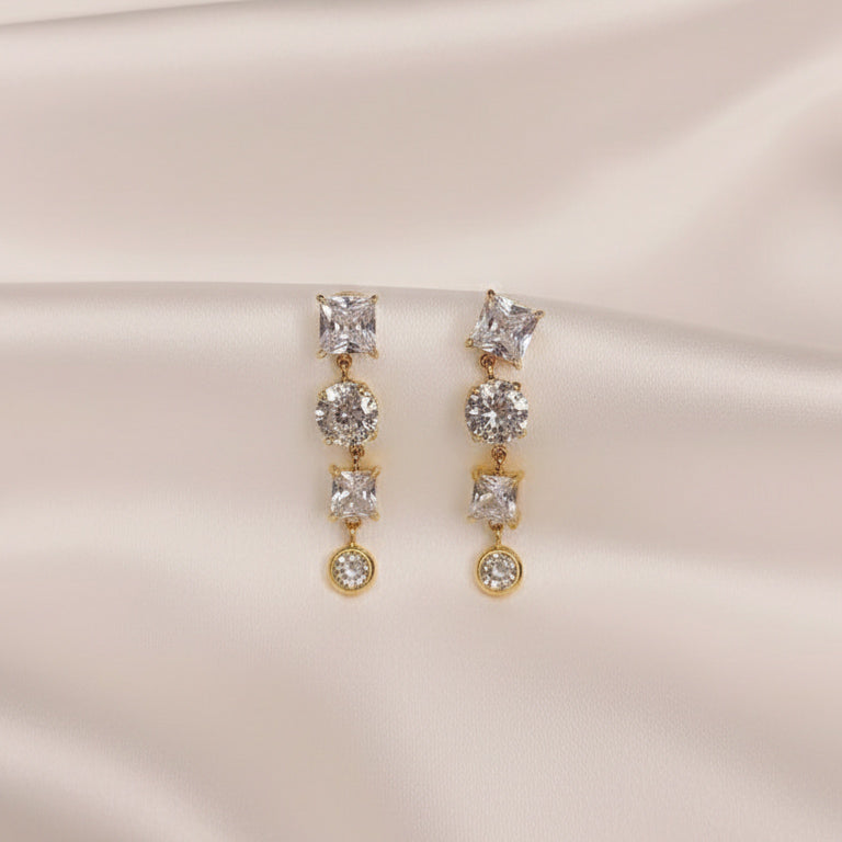 ​Gli orecchini Sofie sono un sofisticato gioco di geometrie e riflessi. Caratterizzati da un elegante design a cascata, alternano con grazia tagli princess e brillanti incastonati su una raffinata base dorata.
